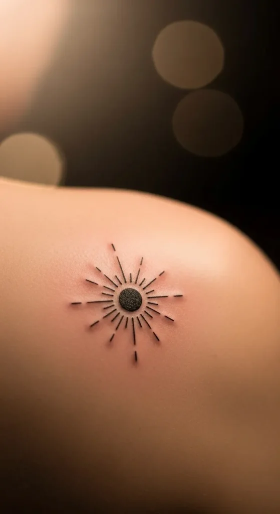 A sun tattoo symbolizes energy, warmth, and positivity. Tiny designs work well on shoulders. Minimal rays and a small center create a clean look. DIY sketches help visualize spacing and size. Black ink keeps it subtle and low-maintenance. Sun tattoos pair nicely with clouds or moons for a celestial theme.